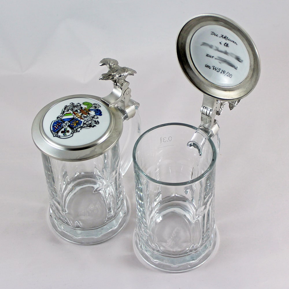 The pewter lid can be ordered with 4 different types (pushers), we can send them by e-mail on demand. Eagle pusher is available for 10 EUR surcharge. We supply all usual types of glasses without surcharge.